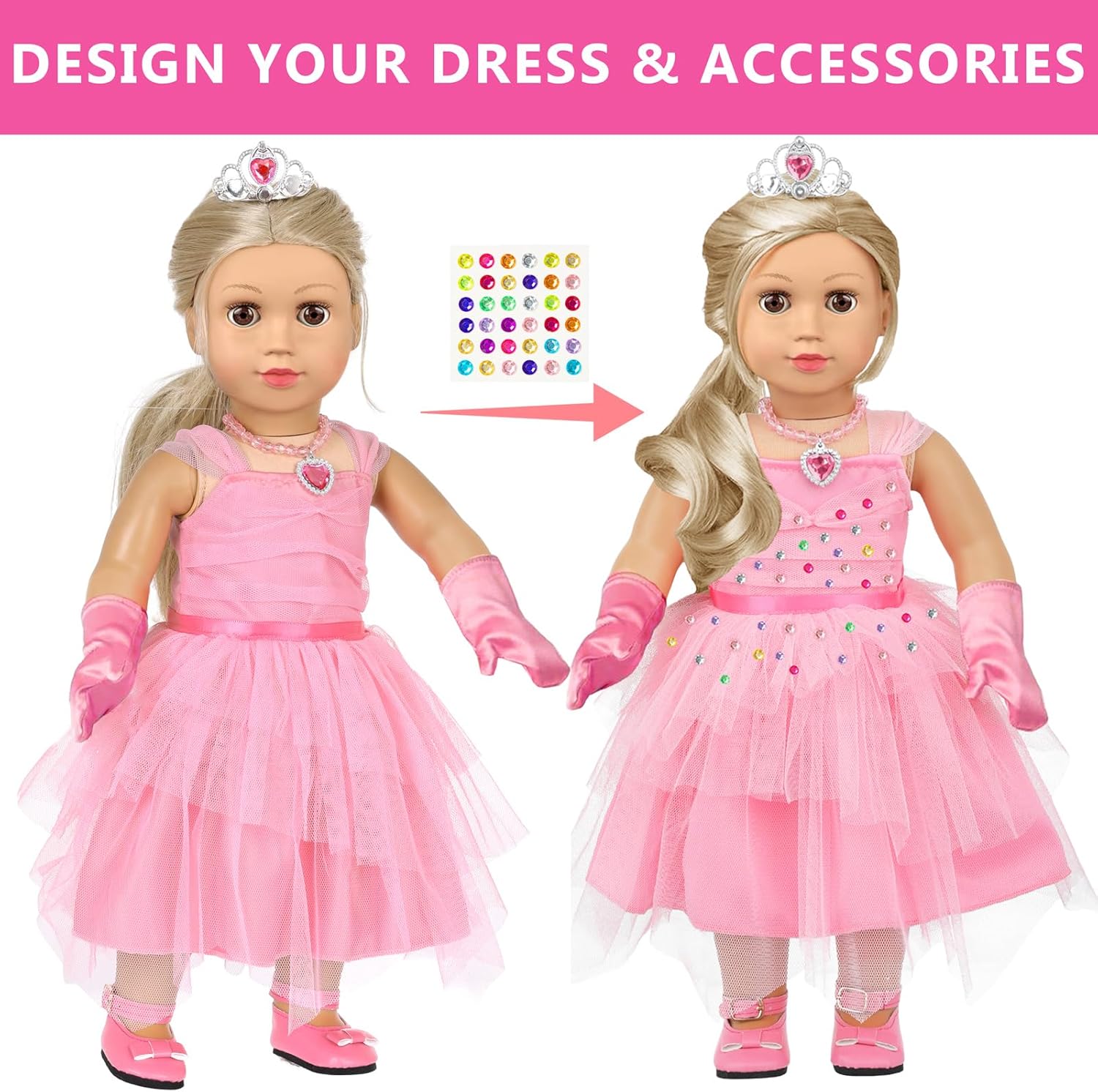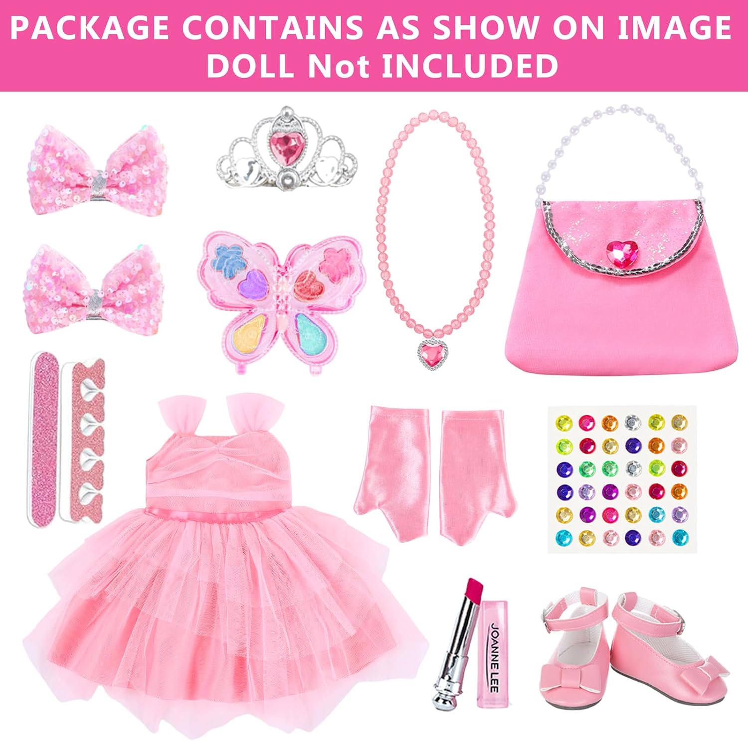Proporcionamos un set completo de maquillaje para muñecas, que incluye vestido de princesa rosa, corona, collar, lápiz labial, paleta de maquillaje, set de uñas, bolso, guantes, zapatos, pedrería adhesiva, pinzas para el cabello [muñeca no incluida].