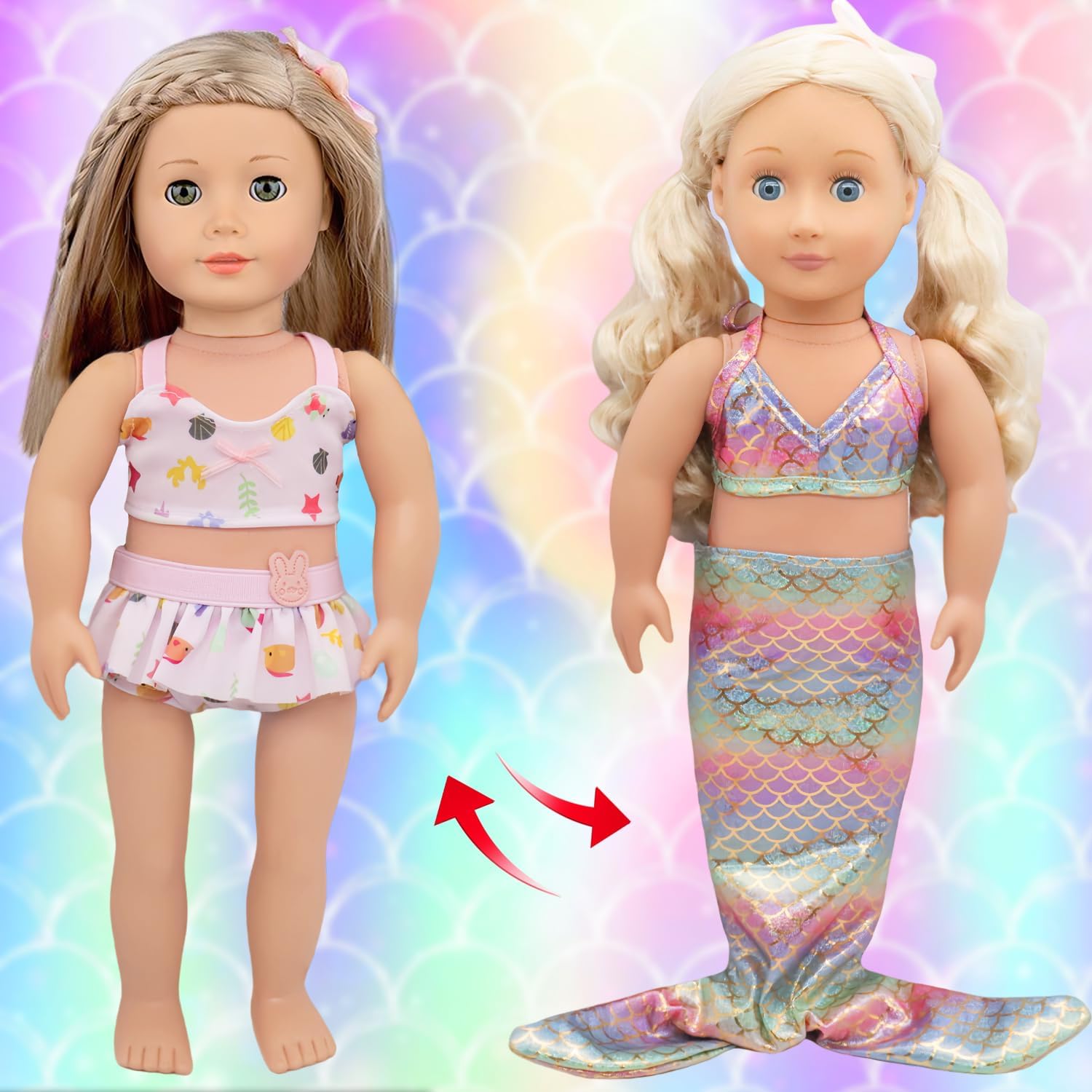 - Aspecto de playa elegante y completo: tu muñeca de 18 pulgadas está lista para brillar en este adorable traje de baño de sirena brillante.