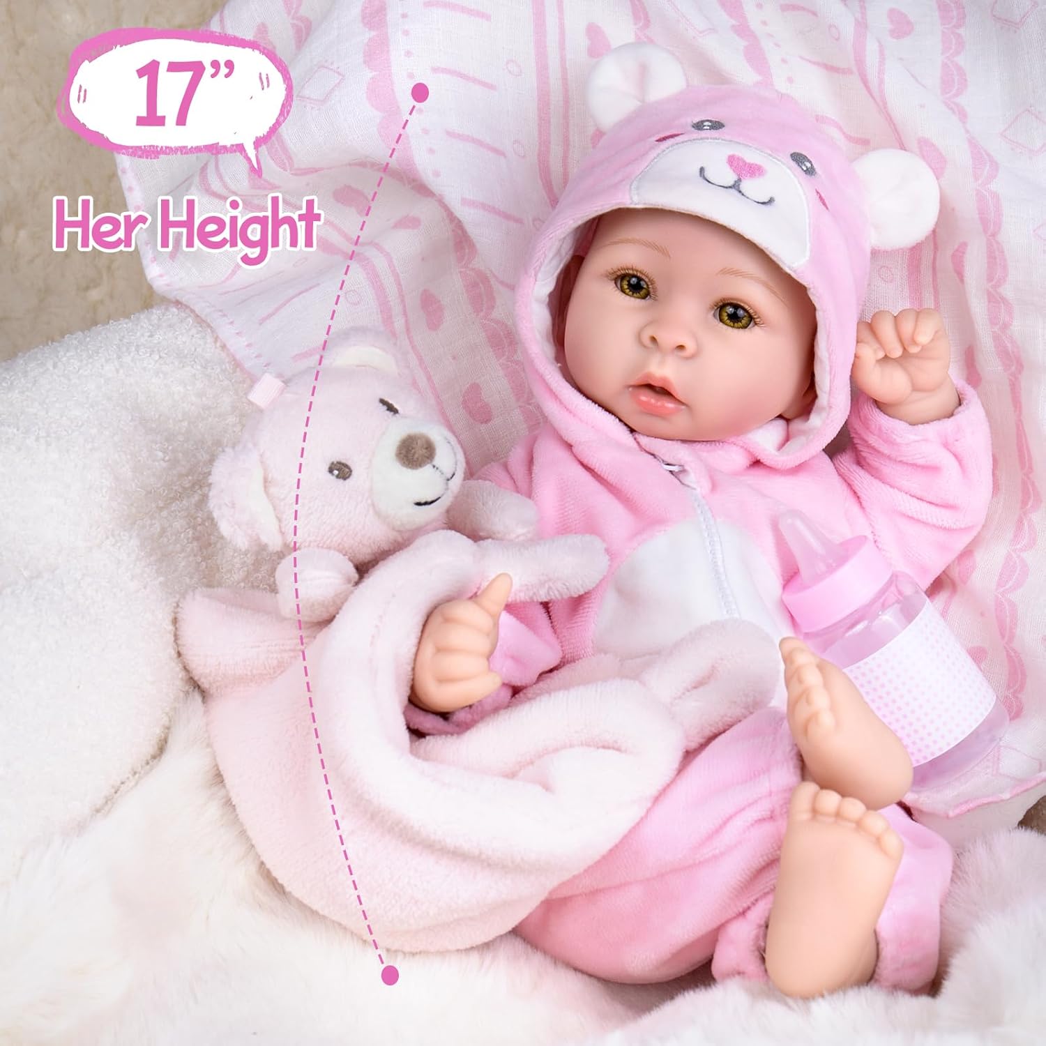 • Muñeca bebé realista: ¡Acurrúquese con nuestra muñeca bebé de 17 pulgadas increíblemente realista! Con pestañas postizas, delicadas uñas de bebé, pliegues de piel realistas en manos y pies y brillantes ojos marrones, se siente y se ve increíblemente real - una adición cautivadora a cualquier colección.
