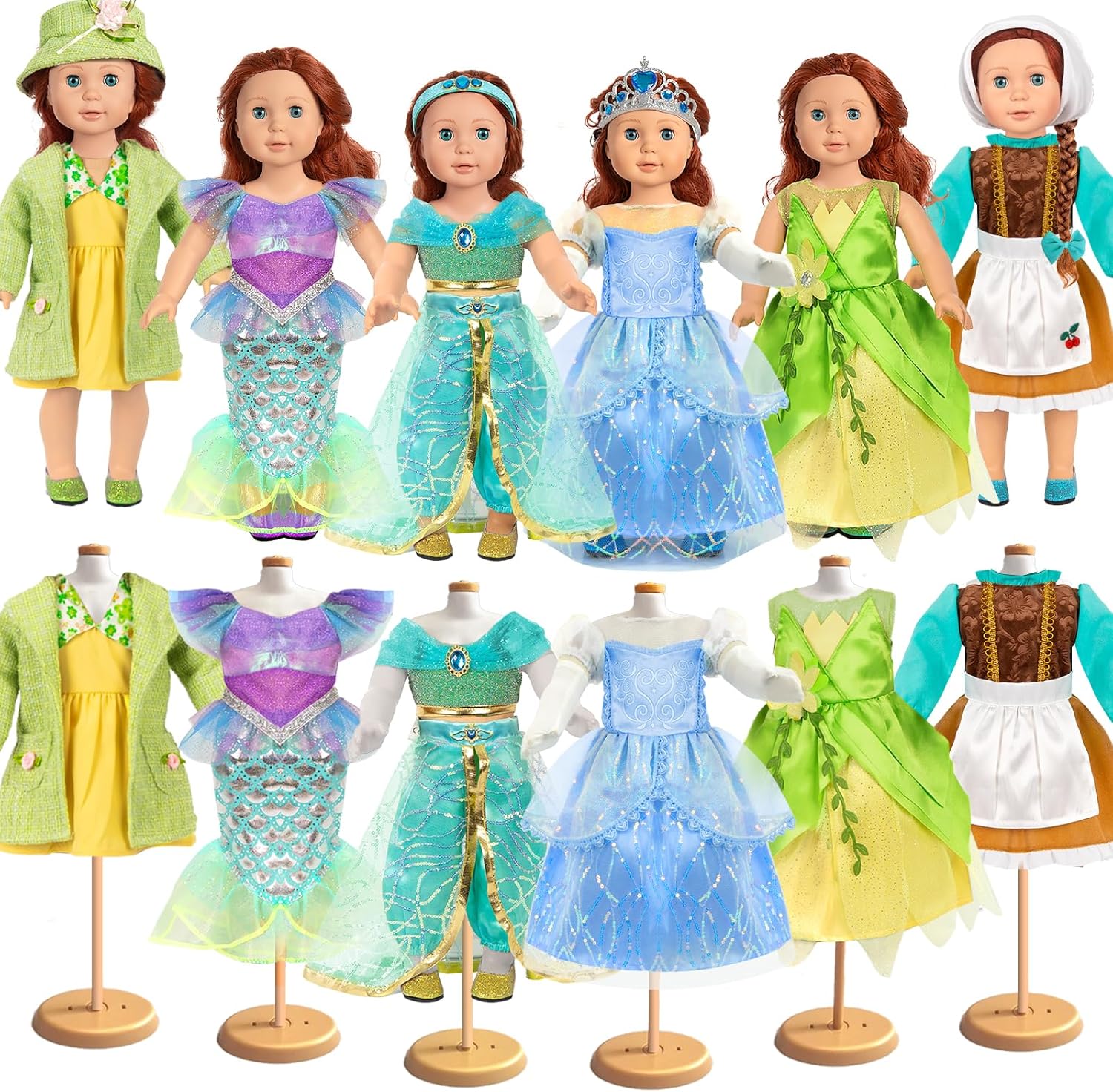 - Conjunto completo de vestuario real: Incluye 6 vestidos premium con tiaras a juego para una transformación completa de princesa (muñecas no incluidas).