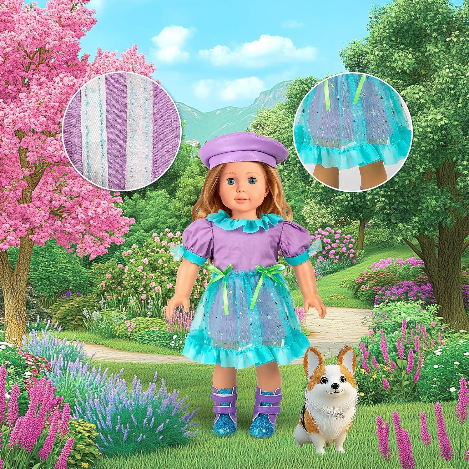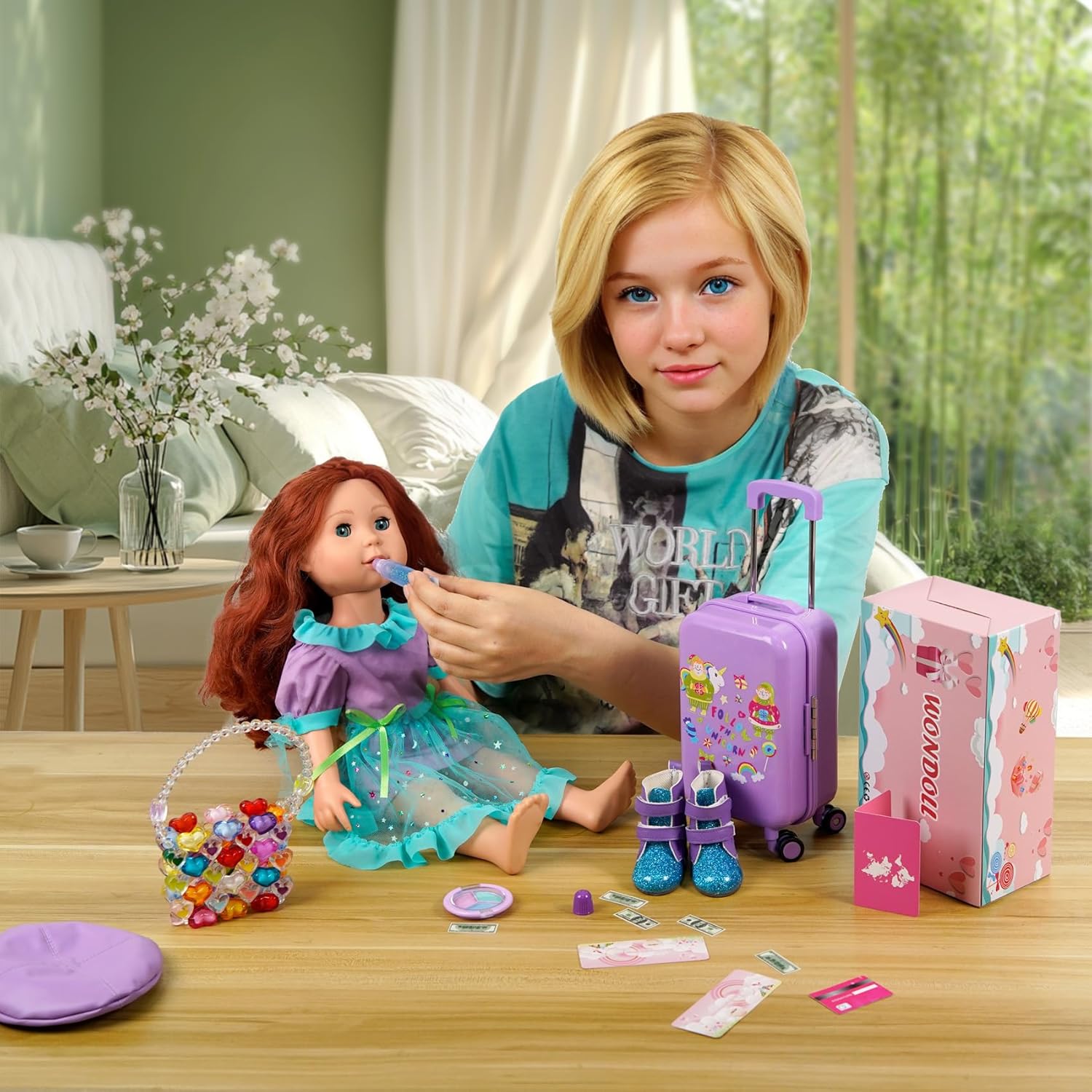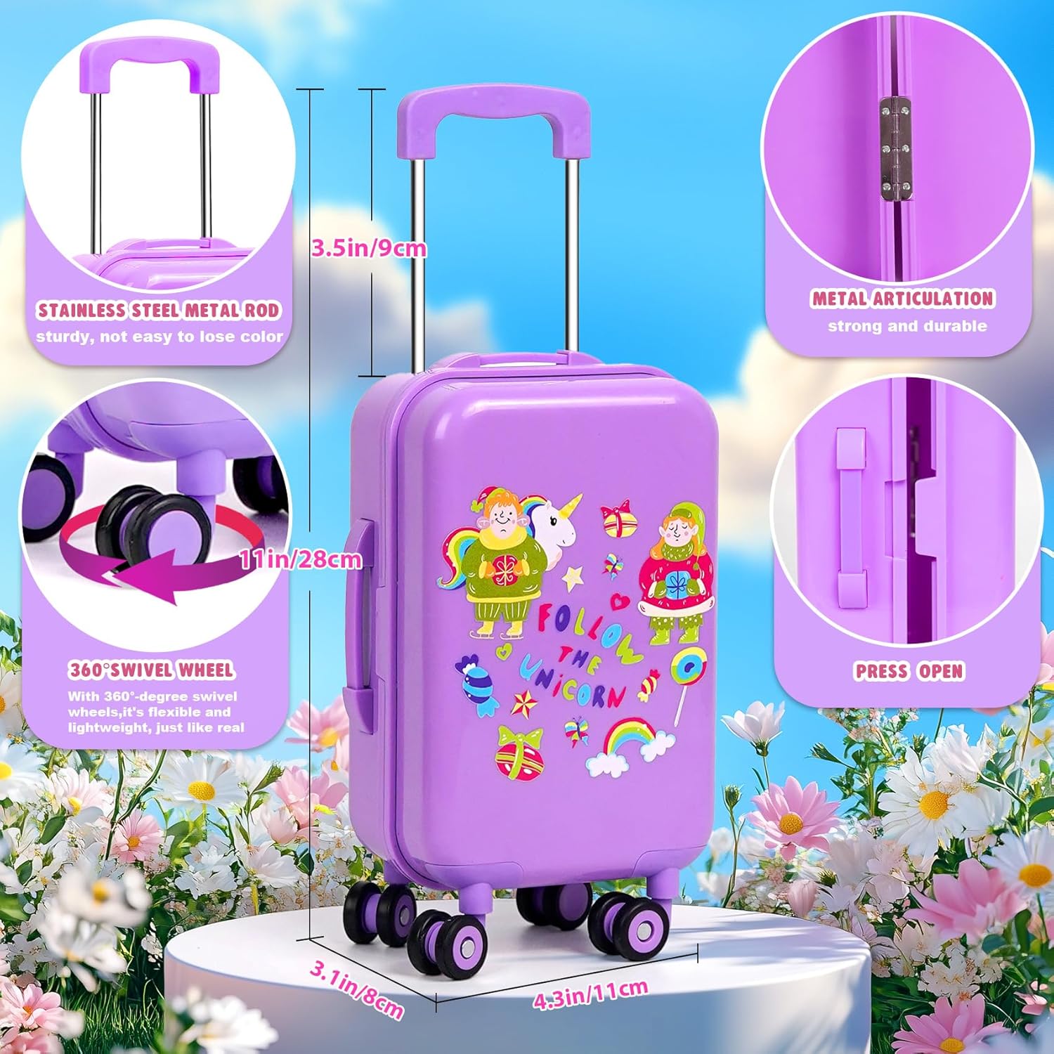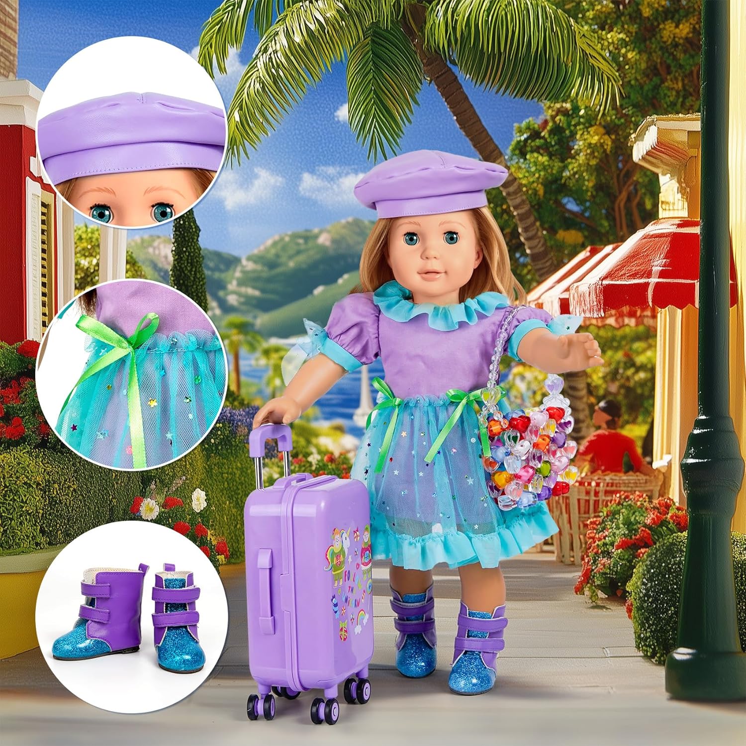 • Lista de contenido: juego de maleta de viaje para muñeca de 18 pulgadas de 26 piezas: 1*equipaje + 1*cámara de proyección + 1*chaqueta de felpa arcoíris + 1*camisa interior con lentejuelas + 1*pantalones de cuero + 1*zapatos + 1*sombrero + 1*polvo de sombra de ojos + 1*bolso de mano + 1*teléfono de juguete + 1*computadora de juguete + 1*alfombrilla de juguete + 1*pasaporte + 1*tarjeta de crédito + 2*boletos de avión + 10*monedas.