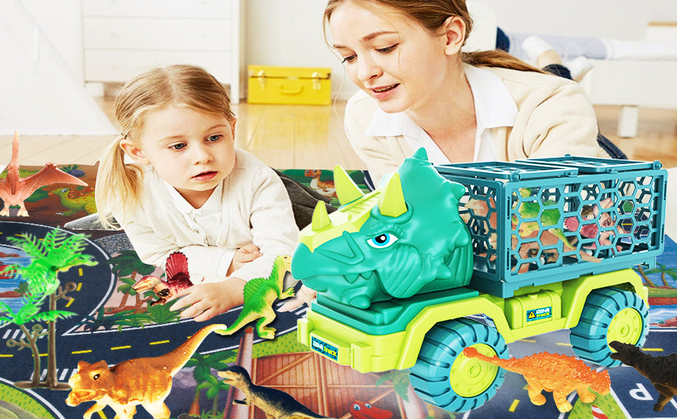 Juguetes de camión de transporte de dinosaurios: el camión de dinosaurios está diseñado con forma realista de triceratops en la parte delantera del automóvil que hace que este juguete de dinosaurio se vea incluso fantástico.
