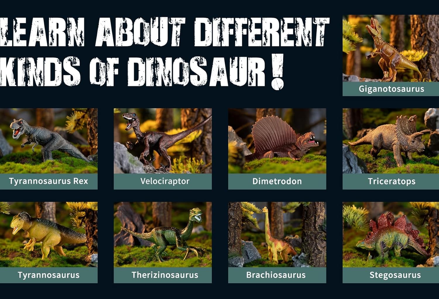 9 dinosaurios coleccionables - Contiene 9 monstruos prehistóricos de la era jurásica: Tyrannosaurus Rex, Triceratops, Giganotosaurus, Therizinosaurus, Stegosaurus, Velociraptor, Acrocanthosaurus, Brachiosaurus, Dimetrodon.