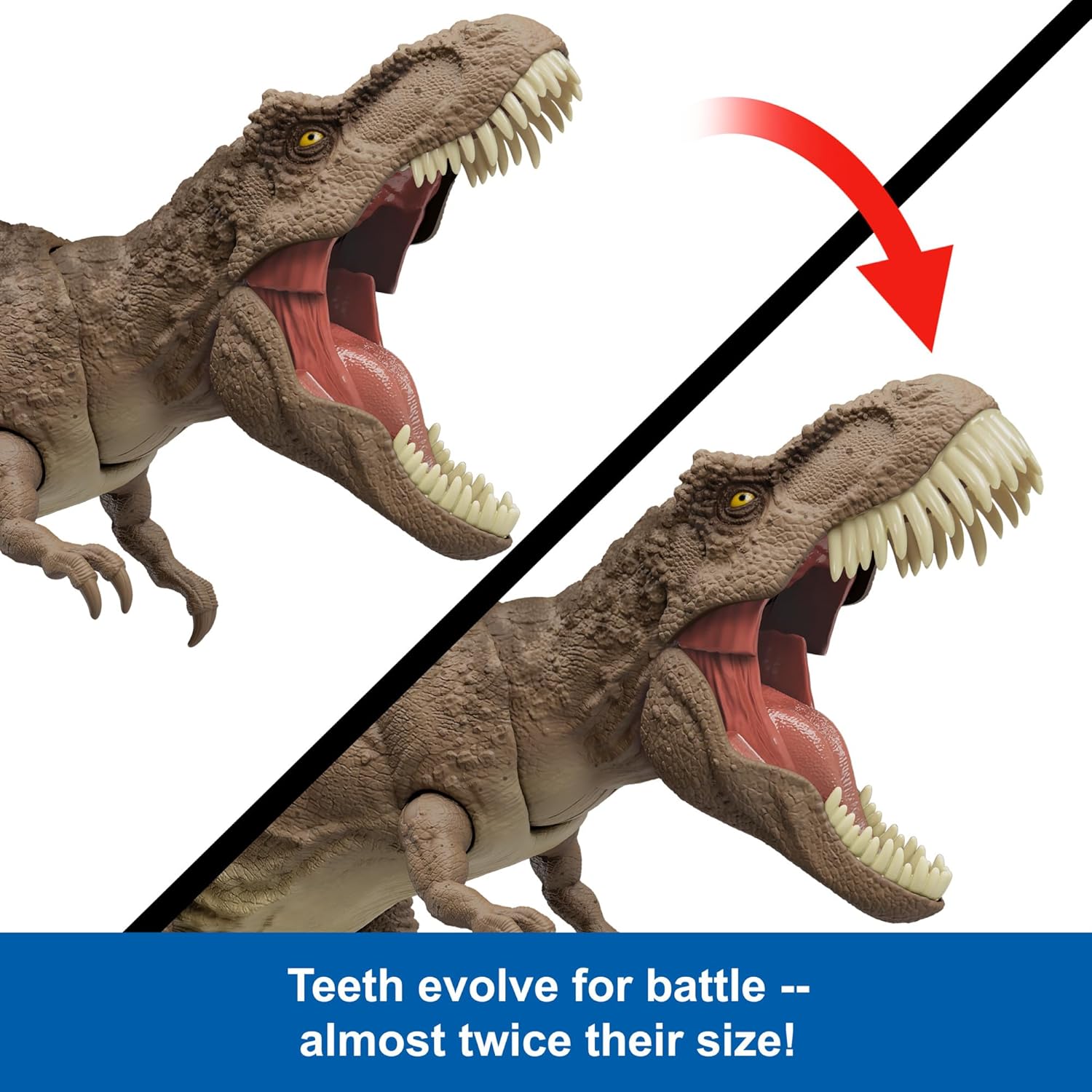 El ataque alboroto de esta figura de acción es un golpe dramático de cuello arriba y abajo, junto con una acción de mordida y sonidos de rugido.