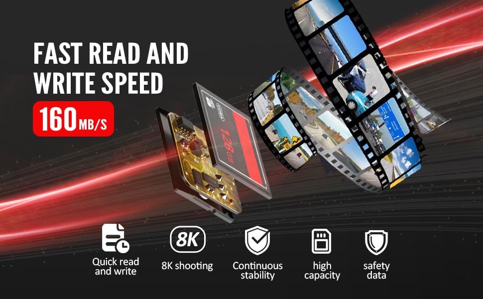 Velocidad de transmisión: la alta velocidad de transferencia de la tarjeta de memoria es rápida y garantiza que puedas transferir rápida y fácilmente tus fotos y videos a tu computadora u otros dispositivos.