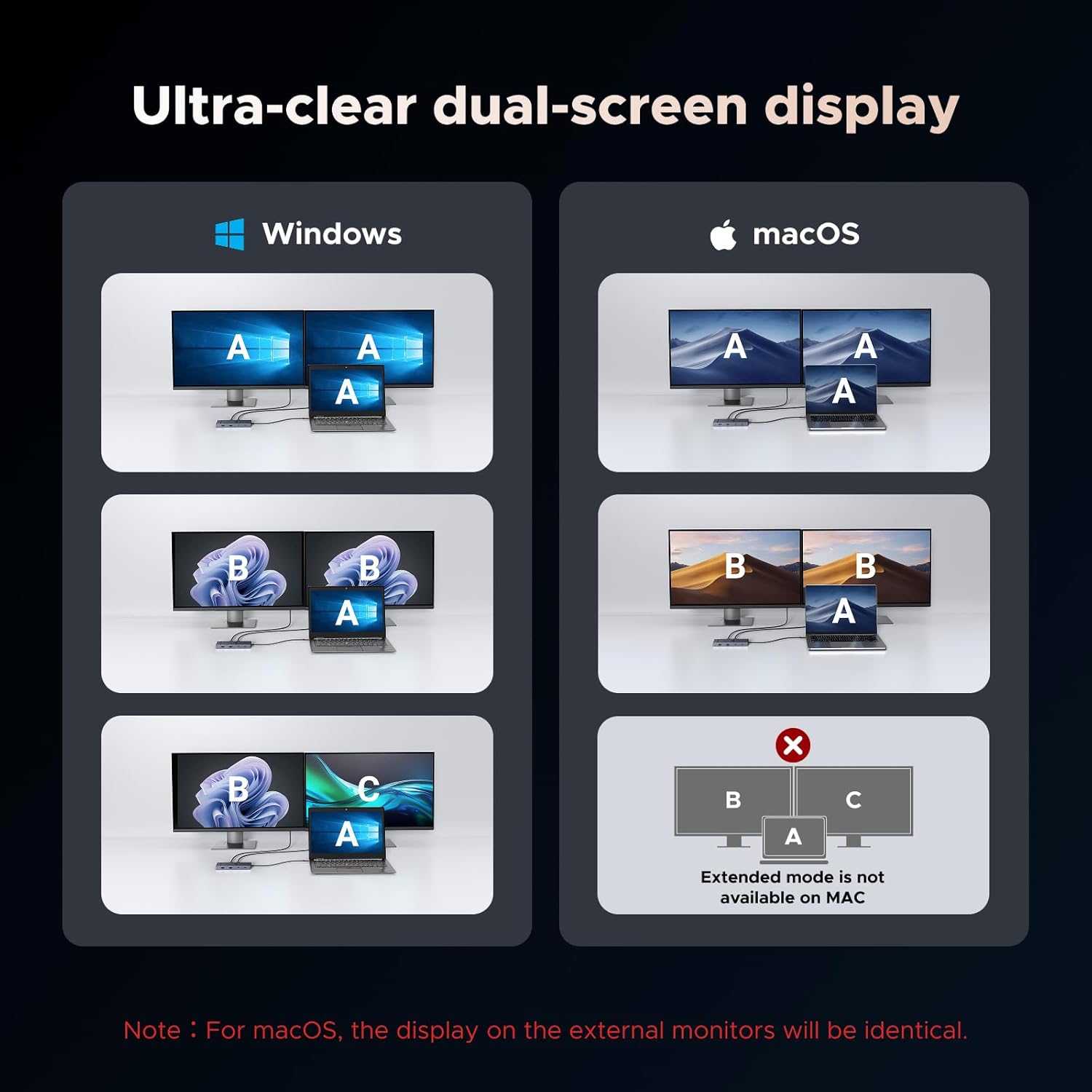 Velocidades de transferencia ultrarrápidas: Esta estación de acoplamiento con hub HDMI USB C dual viene con dos puertos USB A y C para conectar teclados, ratones y transferir datos en USB 3.2.
