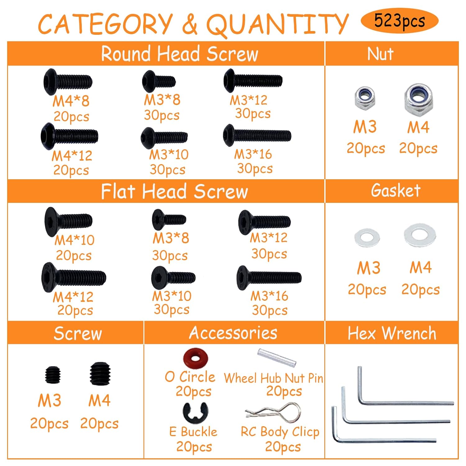 Accesorios RC incluidos: 1 x 520 piezas de tornillos RC, tornillos M3 y M4 (cabeza plana y cabeza redonda), arandelas planas M3 y M4, tuercas de bloqueo M3 y M4, círculo O, pines, clips R, clips E..