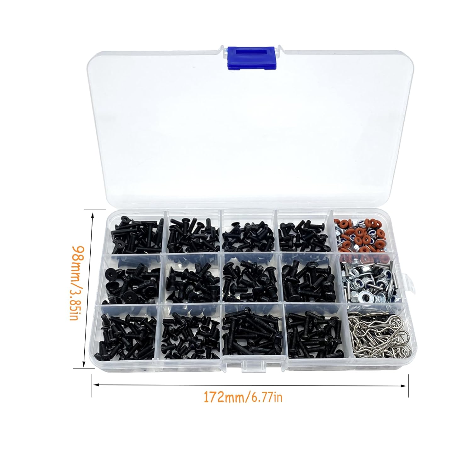 El kit de hardware RC está disponible en 15 tamaños (aproximadamente 6.77in*3.85in), puedes elegir diferentes tamaños de tornillos según varias ocasiones, clasificados en cajas de plástico y almacenados en diferentes rejillas para evitar que los tornillos se mezclen.
