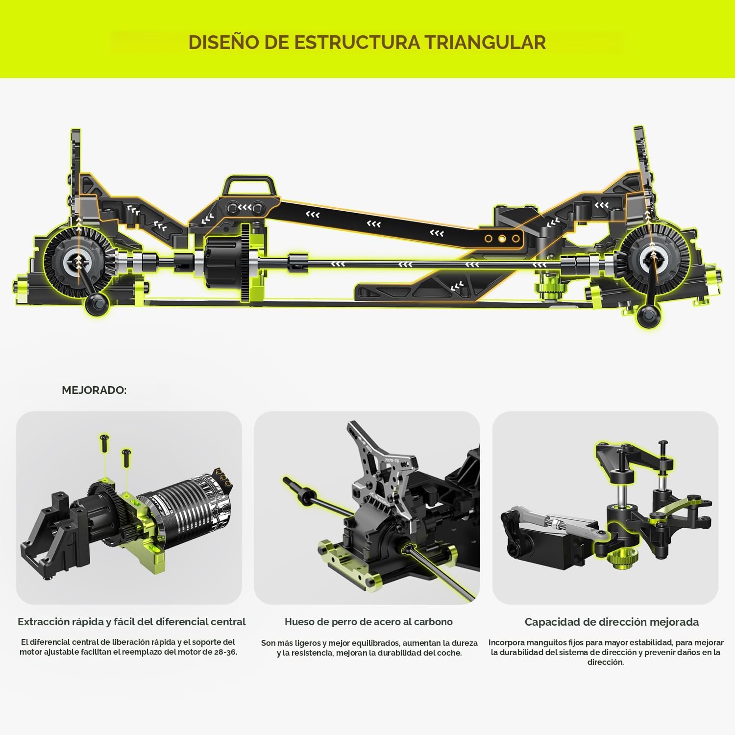 【Transmisión diferencial central】El diferencial central dividido de acero al carbono está construido para durar, y el chasis de aleación engrosado de 2.5 mm puede manejar fácilmente los terrenos más difíciles.