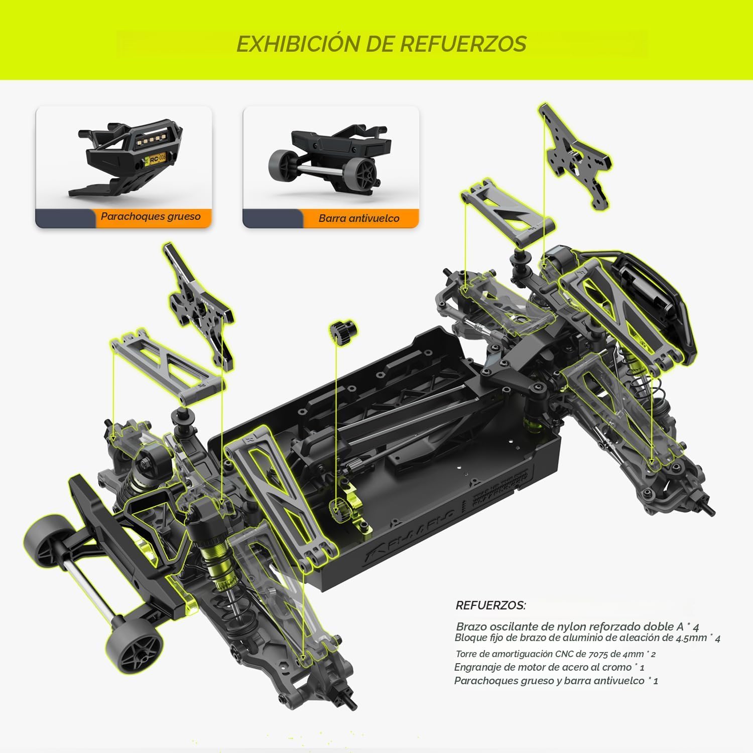 【Compatibilidad versátil y actualización】Compartimento de batería ajustable (compatible con 3S 5500mAh Lipo), soporte de motor ajustable 28-36 y diseño diferencial de liberación rápida es ideal para personalizar el automóvil a control remoto.