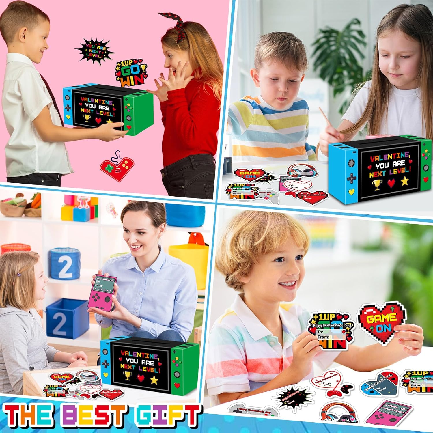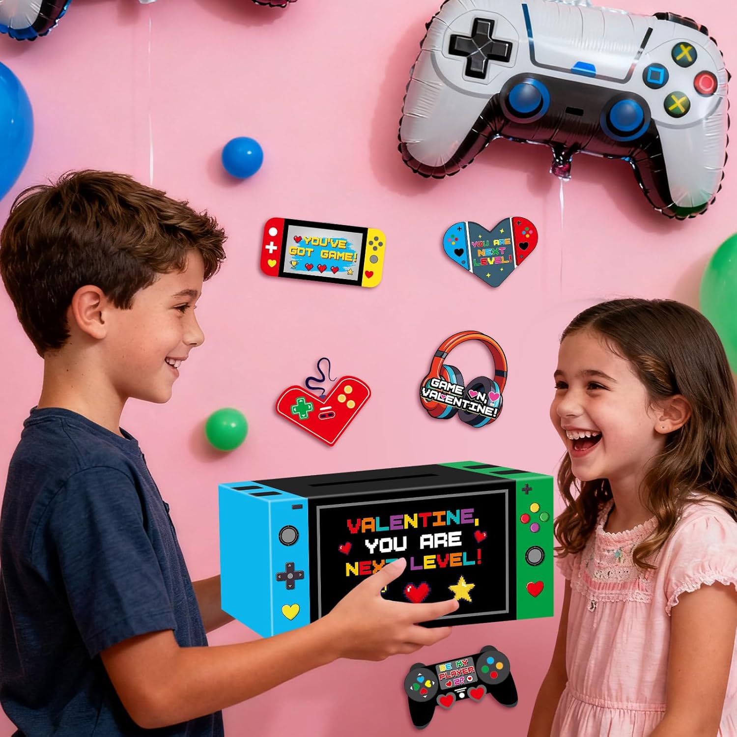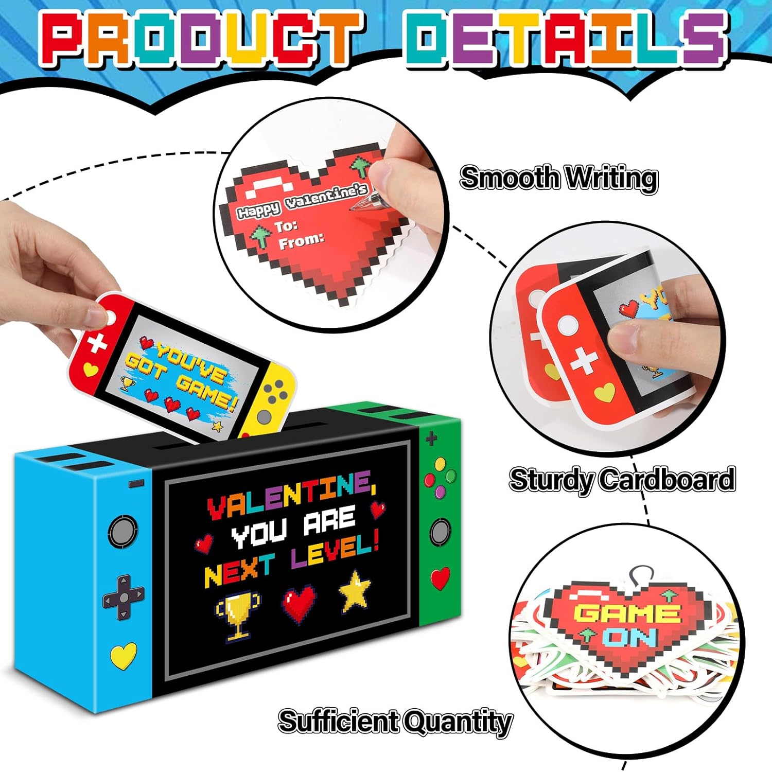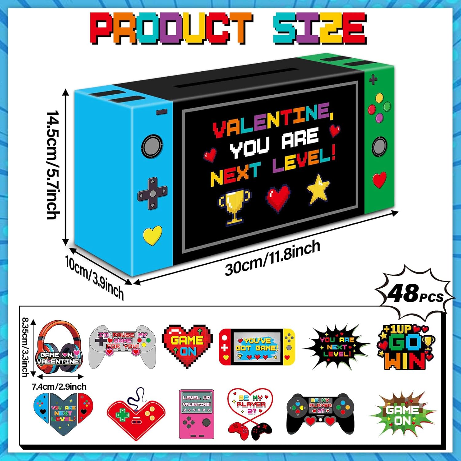 Buzón de San Valentín para niños con 48 tarjetas de felicitación de videojuegos, azul y verde, consola de juegos de mano, caja de tarjetas de San Valentín, regalos de intercambio para niños y niñas, escuela, aula, fiesta Este juego de tarjetas y buzón con temática de juego del Día de San Valentín combina el encanto lúdico de los juegos con dulces intercambios navideños.