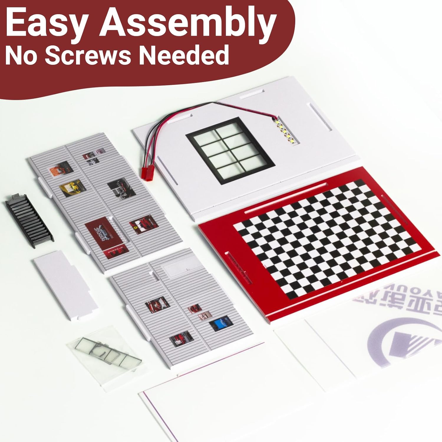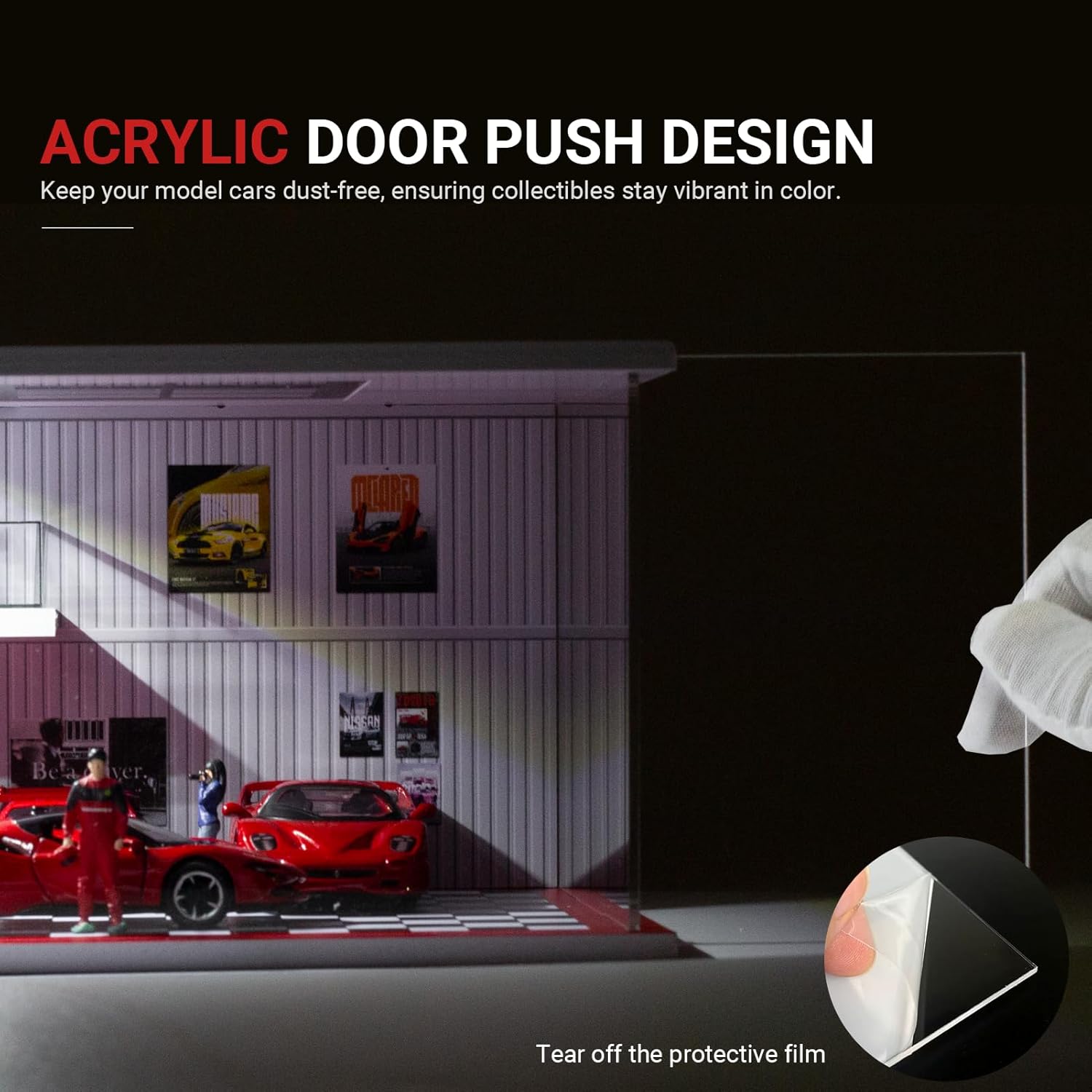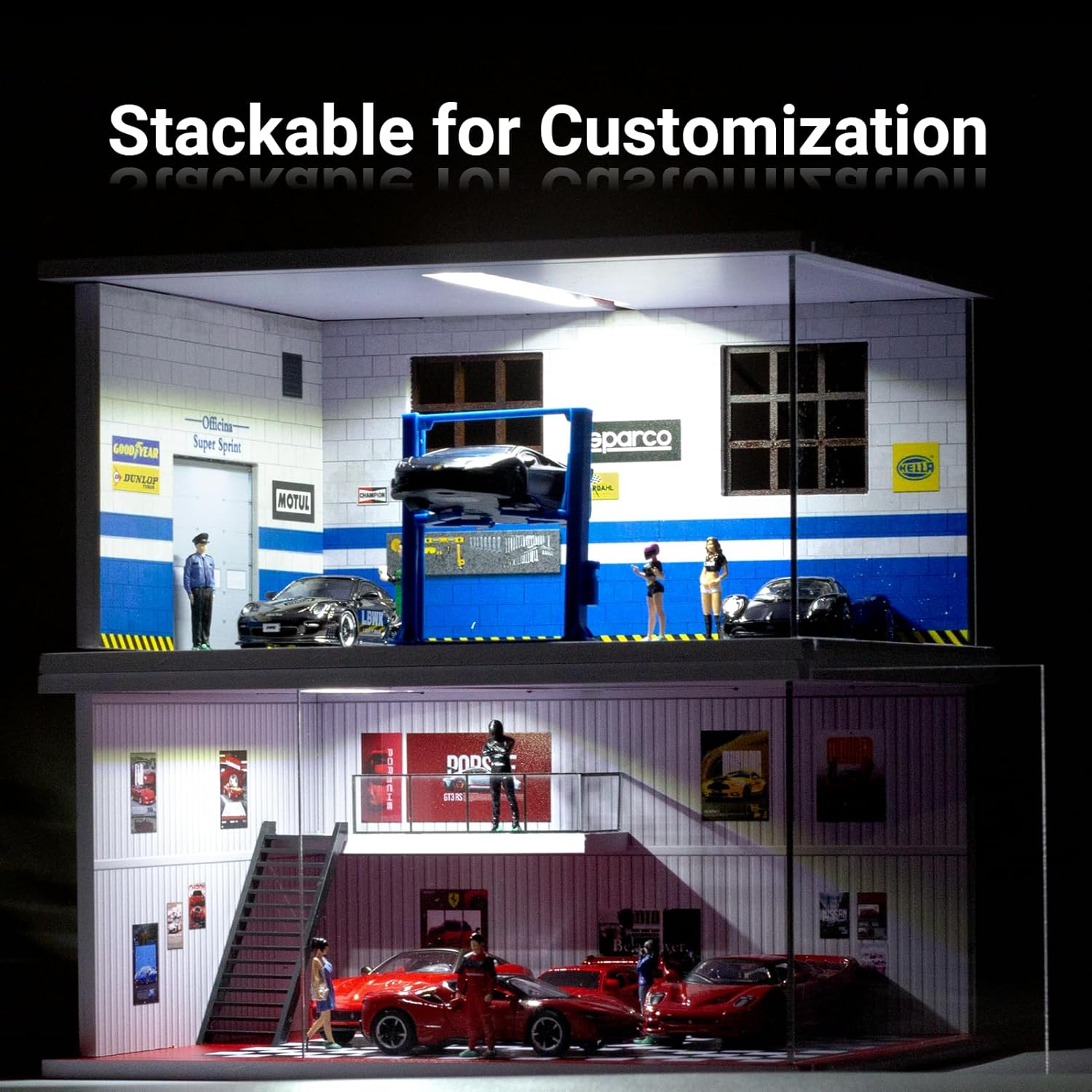 Vitrina de autos a escala 1/64 para exhibición y almacenamiento de autos modelos, garaje apilable con luz LED y cubierta acrílica transparente para ruedas calientes y cajas de cerillas de dioramas de reparación (tipo E).